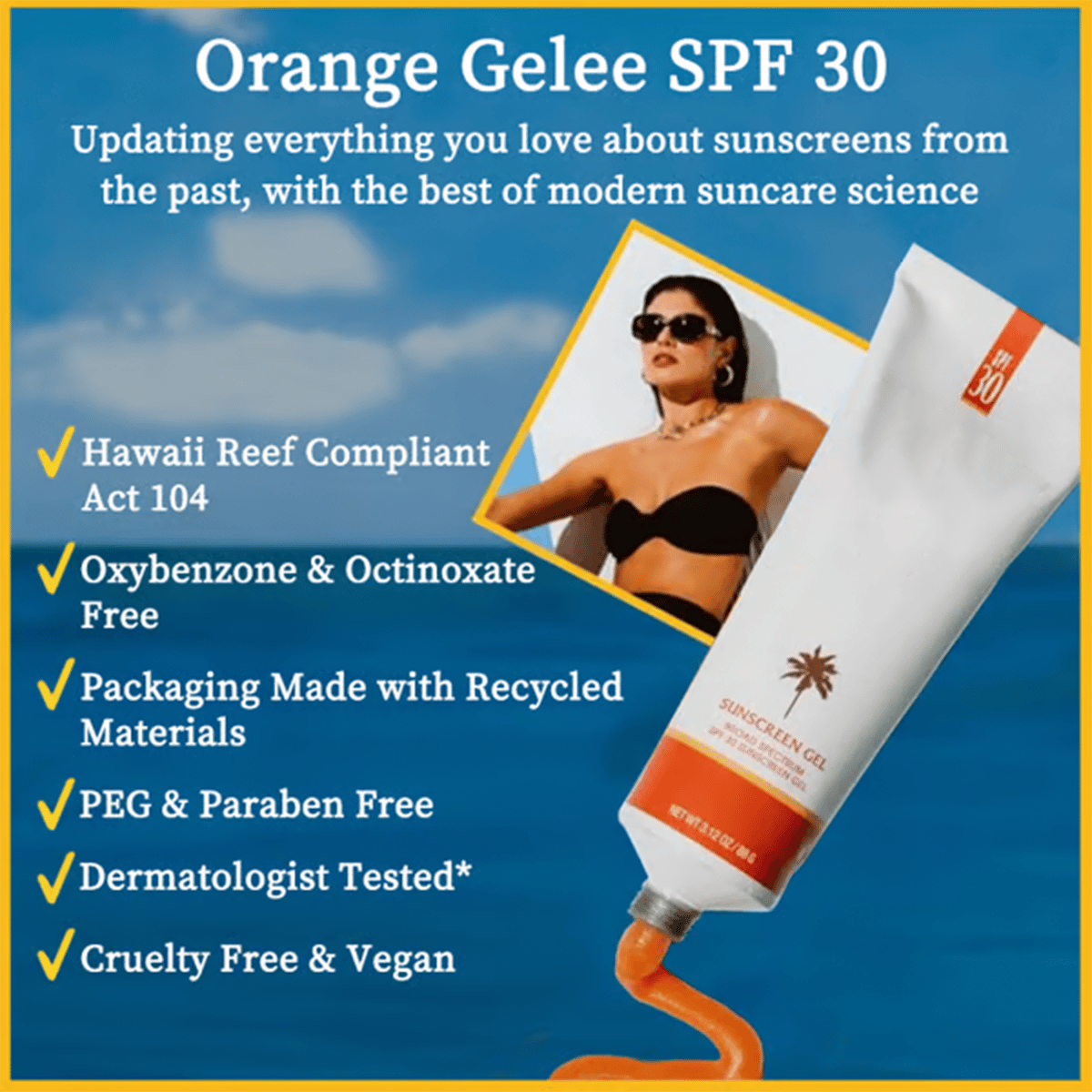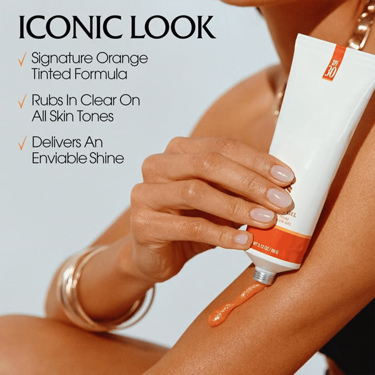 Signature orange-tinted sun gel formula rubs in clear on all skin tones and delivers an enviable shine.